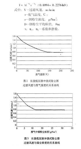 由此可見,脈沖清灰袋式除塵器過濾風(fēng)速與廢氣溫度和廢氣中的煙粉塵濃度成反比,與煙粉塵粒徑的對(duì)數(shù)成正比。