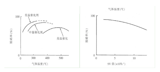但是,**近隨著脫硝裝置適用范圍的擴(kuò)大,同時(shí)也要求催化劑的使用溫度范圍擴(kuò)大,如適用于反應(yīng)溫度200 ℃的垃圾焚化爐(袋濾器出口處設(shè)置的脫硝裝置)的低溫催化劑,或者是適用于反應(yīng)溫度超過550 ℃的單循環(huán)氣輪機(jī)(在氣輪機(jī)出口處設(shè)置的脫氮裝置)的高溫脫硝催化劑,如圖2所示。催化劑反應(yīng)溫度的依賴特性是由催化劑的各種活性成分(V2O5、WO3 等)的含有濃度以及比例所決定的。