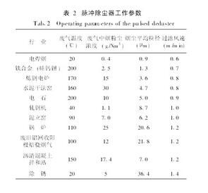 過濾風(fēng)速到底和廢氣溫度、煙粉塵濃度有何具體關(guān)系,我們可從實(shí)驗(yàn)上加以研究,表2是作者為各行業(yè)設(shè)計(jì)的除塵器的工作參數(shù)表(僅選取了除塵效率在9919%以上的設(shè)備或出口排放濃度小于30mg/Nm3的設(shè)備)。
