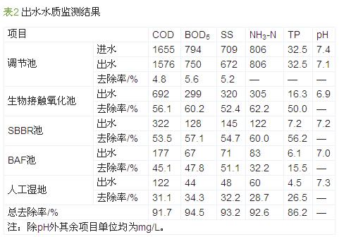 由于豬場(chǎng)沼液的碳氮比低,可生化性差,不適合微生物生長(zhǎng),故定時(shí)向廢水中添加一定量的營(yíng)養(yǎng)物,以提高B/C。系統(tǒng)運(yùn)行至今,各單元處理效果穩(wěn)定,經(jīng)生物接觸氧化、SBBR、BAF、人工濕地處理后,出水水質(zhì)可滿足《畜禽養(yǎng)殖業(yè)污染物排放標(biāo)準(zhǔn)》(GB 18596—2001)中的相關(guān)要求,監(jiān)測(cè)結(jié)果見表2。